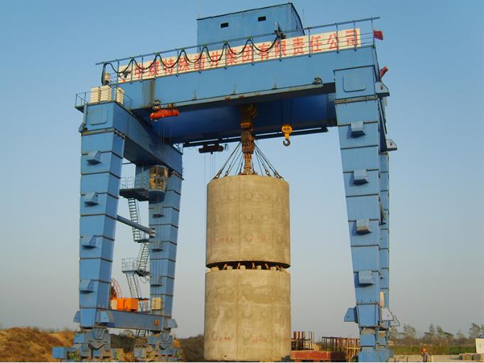 自頂升門式起重機和U型門式起重機類似,門架結(jié)構(gòu)為U型門機,區(qū)別在于支腿不同。由于其它工作場合,大型起吊設(shè)備無法進場,自頂升門機支腿制作成幾段,每段支腿上都有千斤頂頂升支座。小車、主梁端梁組裝好后,采用千斤頂頂起,依次將每段支腿用法蘭連接到一起。之后安裝下橫梁、大車運行機構(gòu)。